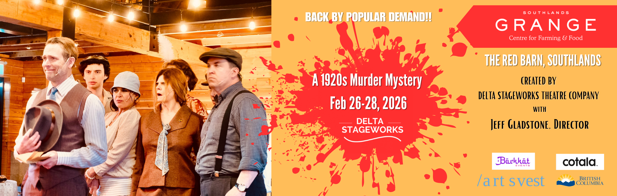A 1920s Murder Mystery THE SHOW IS BACK FOR FEBRUARY 2026!! – an improvised show inspired by real life stories from Lord Don’t Want Me, Devil Won’t Take Me (Dwight & Cullen). Written by Peg Christopherson and Marilyn Norry and directed by, and featuring Jeff Gladstone with the company and guest musicians (image: Red Barn Southlands, May 2025)